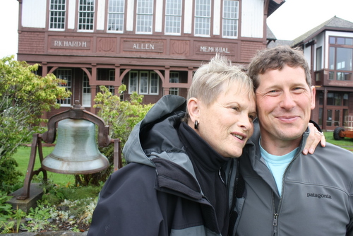 Carol Odess embraces Alaska Arts Southeast Executive Director Roger Schmidt, Monday on the Sheldon Jackson campus. Odess donated $500,000 to restore Allen Memorial Hall. (KCAW photo/Ed Ronco)