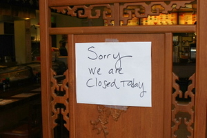 A screen in the door Tuesday told customers that Little Tokyo restaurant in Sitka was closed for the day, while employees worked to clean up inside. A small kitchen fire broke out Monday night. The restaurant’s sprinkler system quickly extinguished the flames, and the restaurant is expected to re-open soon. (Photo by Ed Ronco/KCAW)