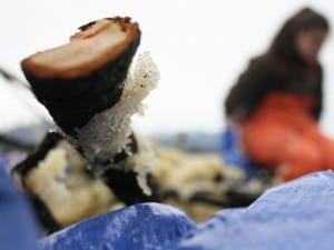 Gill is a fisheries biologist for the Sitka Tribe of Alaska. The eggs they’re gathering are a traditional food, and will be distributed to tribal citizens. In the skiff below is Jeff Feldpausch, Gill’s boss. His official title is resource protection director.