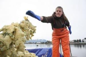 Crew aboard the Sitka-based F/V Pillar Bay tend to the net after the closure of the 2012 herring season. (KCAW file photo)