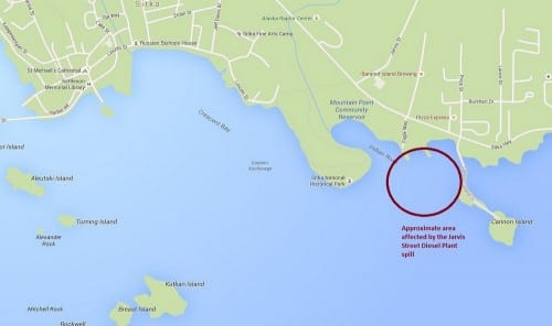 A storage tank at Sitka’s Jarvis Street Diesel Plant failed over the weekend (8-15-15), spilling an estimated 4,000 to 7,000 gallons of diesel into Sitka Sound near the mouth of Indian River.