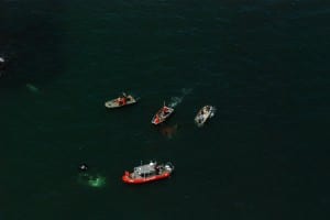 A Coast Guard crew from Station Quillayute River, Wash., along with local emergency response personnel, search the water near James Island, Wash., for crew members and wreckage from CG-6017, which crashed July 7, 2010. (Coast Guard photo by Petty Officer Nathan Litteljohn.)