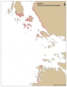 While the commercial harvest slowed over the weekend, spawning continues. As of Saturday, ADF&G had recorded nearly 18 nautical miles.