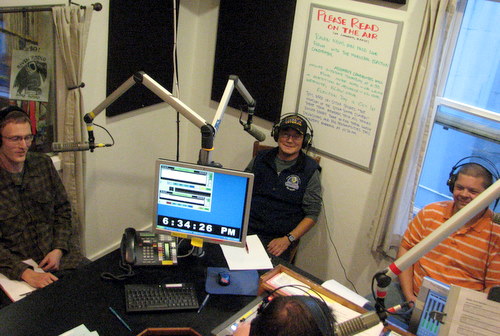 Assembly candidates (l to r) Steven Eisenbeisz, Ben Miyasato, and Aaron Swanson take listener calls on Thursday (9-26-13). (KCAW photo/Robert Woolsey)