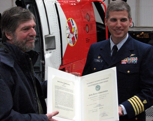 John Hagen was presented with the Public Service Commendation in a ceremony at Air Station Sitka Thursday morning (11-7-13), as the station’s pilots and officers stood by in full dress uniform.