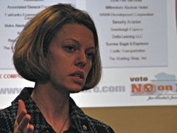 Alaska Oil and Gas Association President Kara Moriarty addresses the Sitka Chamber of Commerce. (KCAW photo/by Emily Forman)