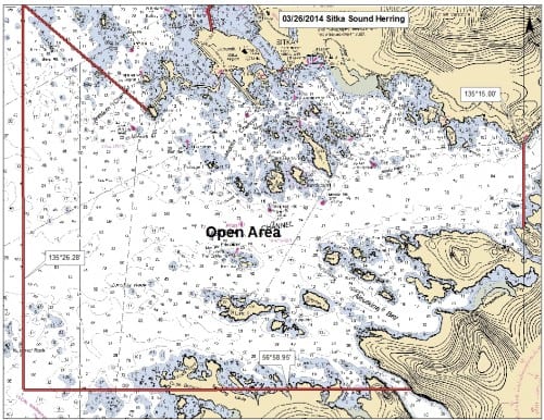 The Alaska Department of Fish & Game released this map, showing where fishing is allowed in today’s herring opening. (Map courtesy of ADF&G)
