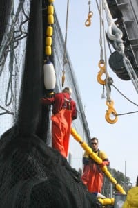 Crew aboard the Sitka-based F/V Pillar Bay tend to the net on Thursday afternoon. The 2012 herring season in Sitka ended Thursday, when ADF&G announced there would be no further openings. (KCAW photo/Ed Ronco)