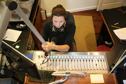Rachel Waldholz gets ready to go on air with the afternoon newscast. Waldholz, from UC Berkeley's Graduate School of Journalism, wrapped up her 10 weeks in Sitka on Friday.