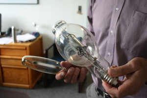 Johnston holds mercury vapor bulbs the campus used as emergency lighting. Four 400 watt bulbs have been replaced with a single 52-watt fluorescent bulb. (KCAW photo/Ed Ronco)
