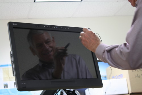 UAS Sitka campus director Jeff Johnston shows a new touchscreen monitor that instructors will use in a new exhibit hall at the campus. It’s part of a nearly $4 million renovation. (KCAW photo/Ed Ronco)