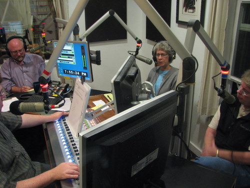 Mayoral candidate Mim McConnell (center) answers a listener question while candidate Thor Christianson (left) and Mayor Cheryl Westover (right) listen in. (KCAW photo/Robert Woolsey)