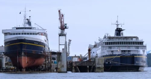 The ferry Malaspina is in drydock and the Columbia is tied up at the Ketchikan Shipyard in this 2012 photo. More ferry work is proposed in Gov. Walker’s FY 2016 draft capital budget. (Ed Schoenfeld/CoastAlaska News)