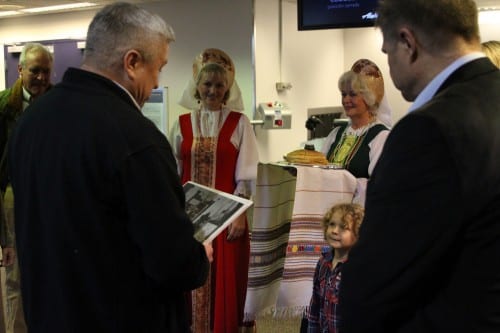 Zlata Lund came down from Anchorage to serve as a translator. Her mother Natalia joined her, presenting Asin a stack of blinis – thin pancakes – on a silver platter. (Emily Kwong/KCAW photo)