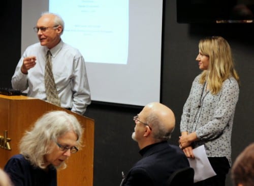 City administrator Mark Gorman tells the Chamber that Sitka’s financial future looks “a little stressed,” but he also expressed faith in the community’s resiliency. Maegan Bosak (r.) looks on. Mayor Mim McConnell and finance director Jay Sweeney are in the foreground. (KCAW photo/Robert Woolsey)