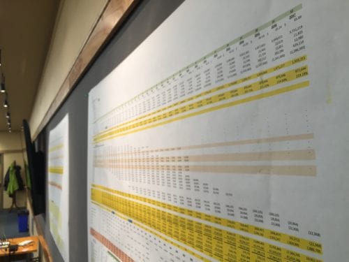The city finance department hung two worksheets on the walls of the Sitka Assembly chamber, mapping out cash flow for the water and wastewater funds from 2013 to 2047. The department is working with Public Works to plan for major infrastructure repairs over the next several decades. (Emily Kwong/KCAW photo)
