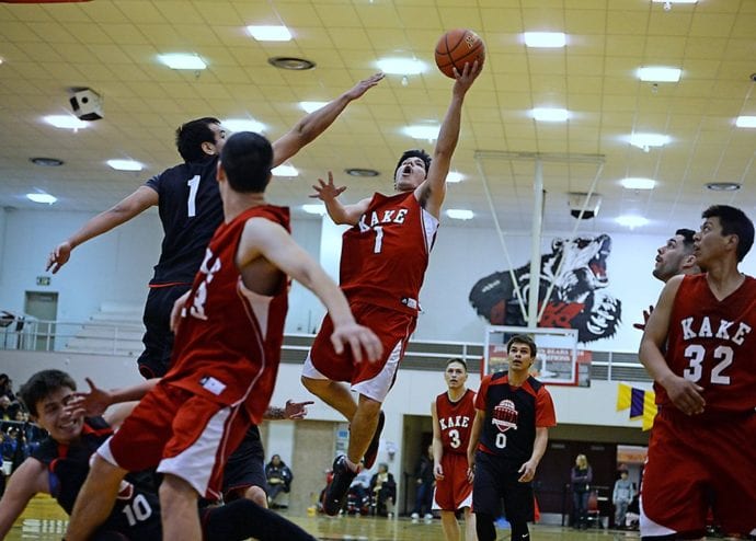 Kake’s Xavier Friday (1) floats a shot over Hoonah’s George Fisher (1) in their B-Bracket game of the Juneau-Lions Club 71st Annual Gold Medal Basketball Tournament at Juneau-Douglas High School on Monday. Hoonah won 61-57. (Photo courtesy Klas Stolpe)