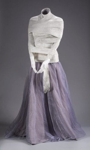 Carmel Anderson contemplates a mannequin. Wrapped in a purple organza skirt, the mannequin’s arms are pinned to her chest with an ace bandage. The piece is called “Bound.” Pointing to the mannequin’s fingertips, which are lightly touching, Anderson says she wants her work to show that abuse can be subtle.