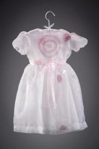 In a different room of the exhibit, which was set up in Whitmore Hall on the Sitka Fine Arts Campus, Anderson hung a chiffon dress in a closet. It’s a party dress embroidered with pink flowers, meant for a child. But on the back, Anderson has painted a red target.