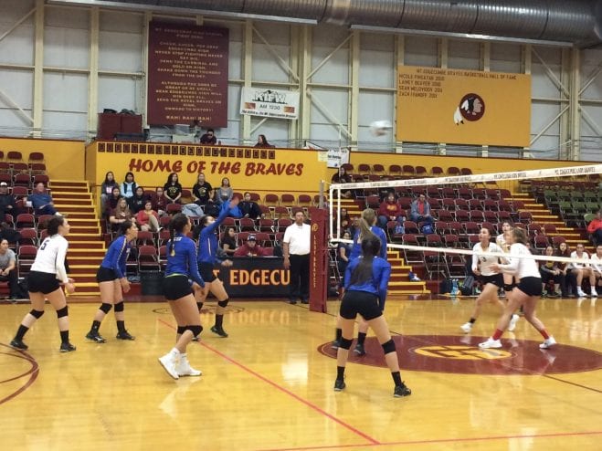 Mount Edgecumbe’s gym was pretty full for a Saturday morning. The school’s Lady Braves are the state’s defending volleyball champions and they’re hosting the Kotzebue Huskies. The game starts with the Braves chanting “Edgecumbe! Edgecumbe!”