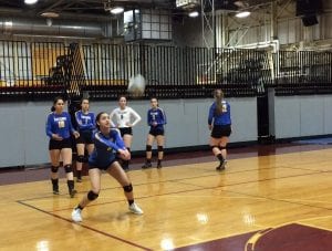 The Huskies warmed up for their game against the Mount Edgecumbe Lady Braves, Alaska’s defending volleyball state champions. (Photo by Sarah Gibson, KCAW – Sitka)