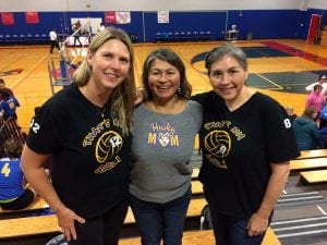 Three of the Huskies “Mom Squad” also made the trip. From L to R: Cathy McConnell, Annie Howarth, and Corina Kramer. (Photo by Sarah Gibson, KCAW – Sitka)