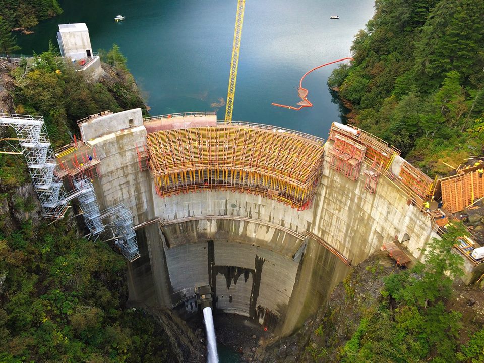 The Blue Lake dam under construction in September, 2014. Half of all electric bills in Sitka now pay down the debt to build it. On the upside: Sitka has 40-percent excess capacity, and can afford to attract major industry. (Blue Lake Expansion photo/Desiree Brandis)