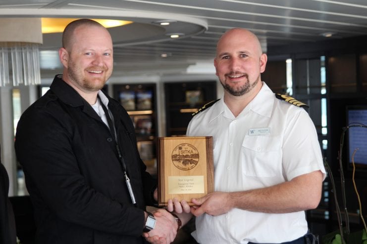 City Administrator Keith Brady presents a plaque to Captain Ned Tutton, marking the first port of call by the Star Legend to Sitka. (Emily Kwong/KCAW photo)
