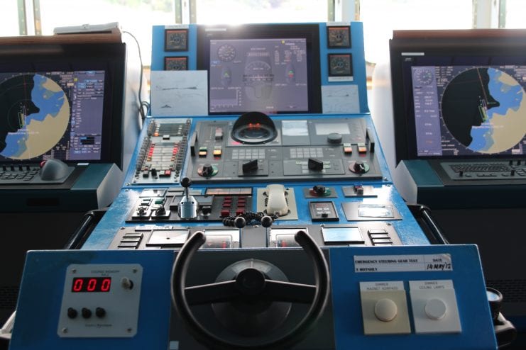 The bridge of the Star Legend. Propped among the equipment are drawings of whales, which the captain will identify for passengers over the PA system. (Emily Kwong/KCAW photo)