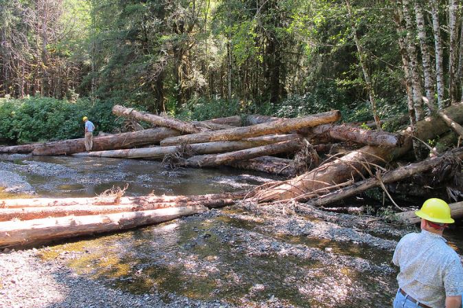 Forest Service employees Don Martin and John Lane inspect an in-stream restoration structure on 12-Mile Creek, on Prince of Wales Island. Many Sitkans want to encourage further efforts toward habitat restoration, rather than revisit the roadless debate which they consider closed following the 2016 Tongass Land Management Plan. (USDA photo/Ron Medel)