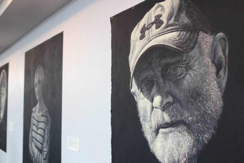 “Faces of Sitka” is in intimate collection of full-scale portraits by local artist Steve Lawrie of the places and people he loves. Featured here are portraits of Pat Welsh and Sarah Lawrie, the artist’s daughter. Steve Lawrie will debut an even larger exhibit in Fall 2019. (Emily Kwong/KCAW photo)