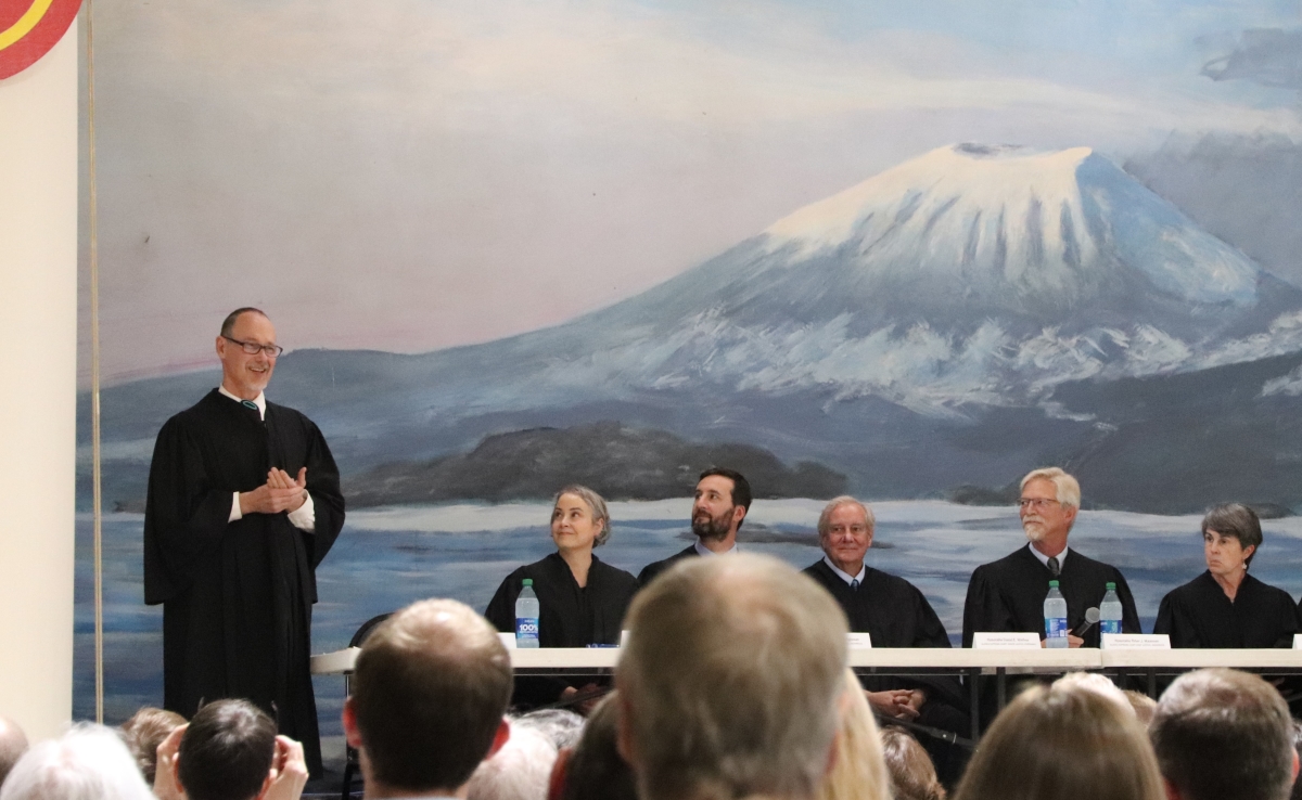 As he finished his oath, the crowd roared, cheering Pate on in the first of two spontaneous standing ovations he received during the ceremony. Over the last several decades, Pate served as counsel for the Sitka Tribe of Alaska, in private practice, as a public defender, and most recently, as Sitka’s Superior Court Judge. It was clear from the jubilant energy in the room that Pate had touched many corners of the community, said Chief Justice Peter Maassen.