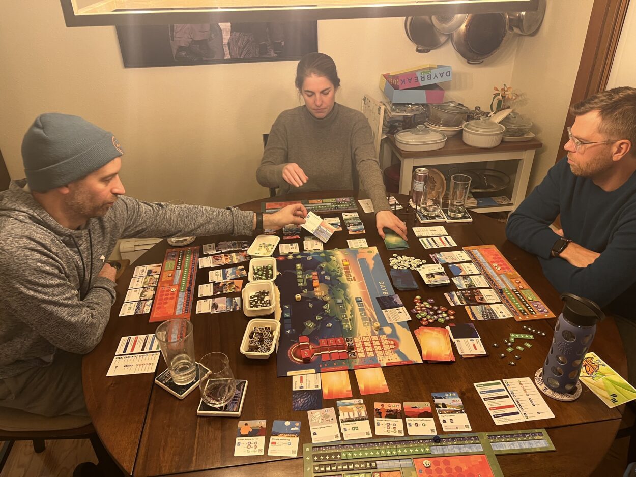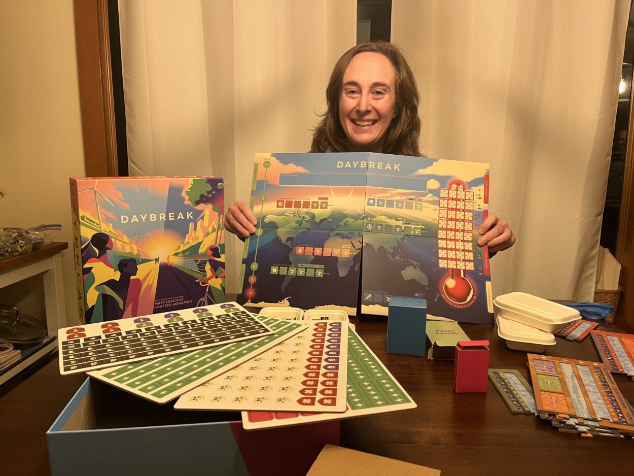 The group of friends is playing Daybreak, a new game released by designers Matt Leacock and Matteo Menapace. To play, global superpowers – represented by the US, China, Europe, and the “majority world” – work together to alleviate the climate crisis before the earth’s temperature rises by two degrees Celsius. Players win as a team by reaching drawdown, when no net carbon is going into the atmosphere.
