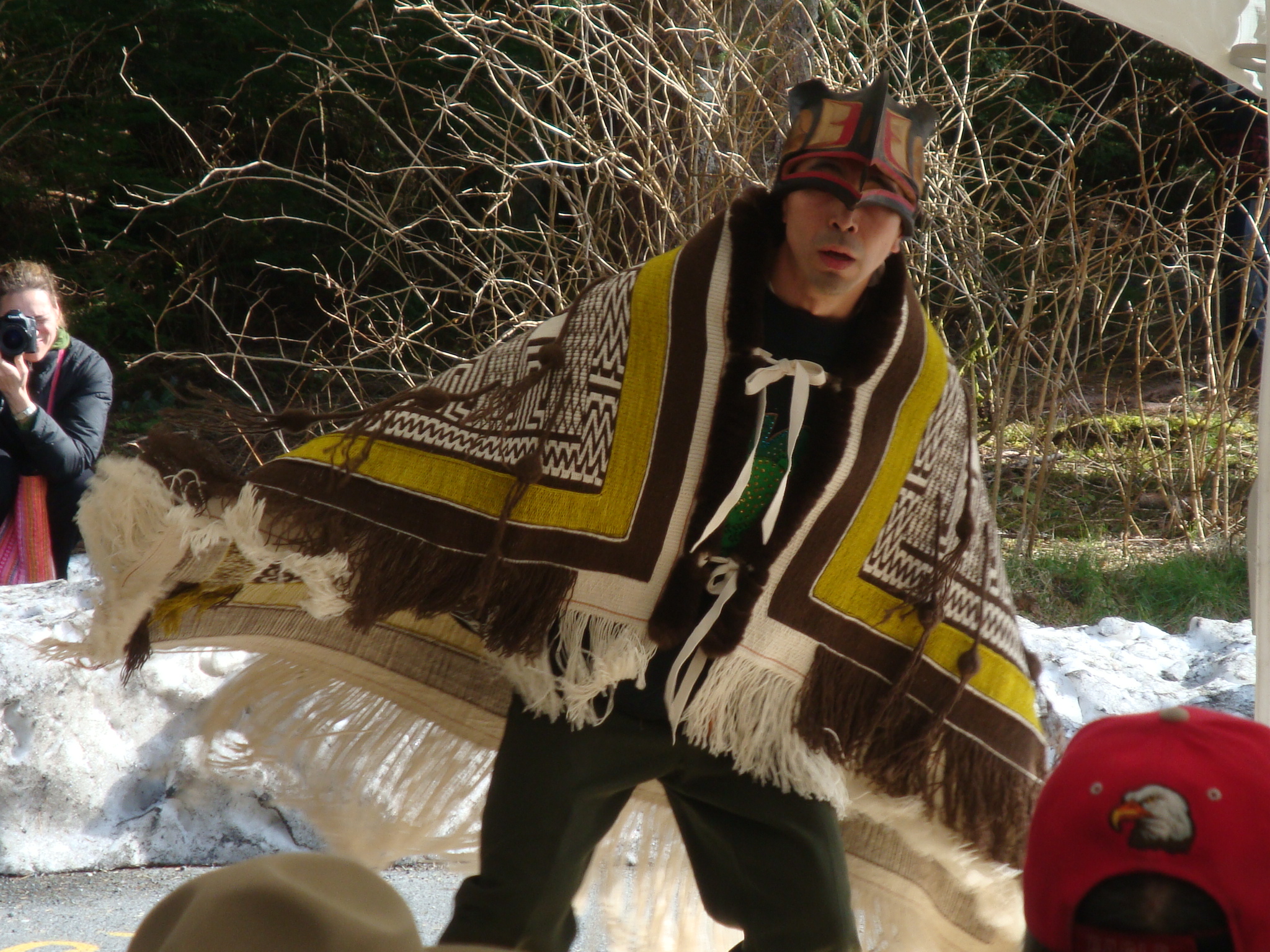 Tom Gamble wears and dances in a raven's tail robe by Sitka artist Teri Rofkar. The robe was commissioned for the park's 100th birthday and was unveilled Sunday.
