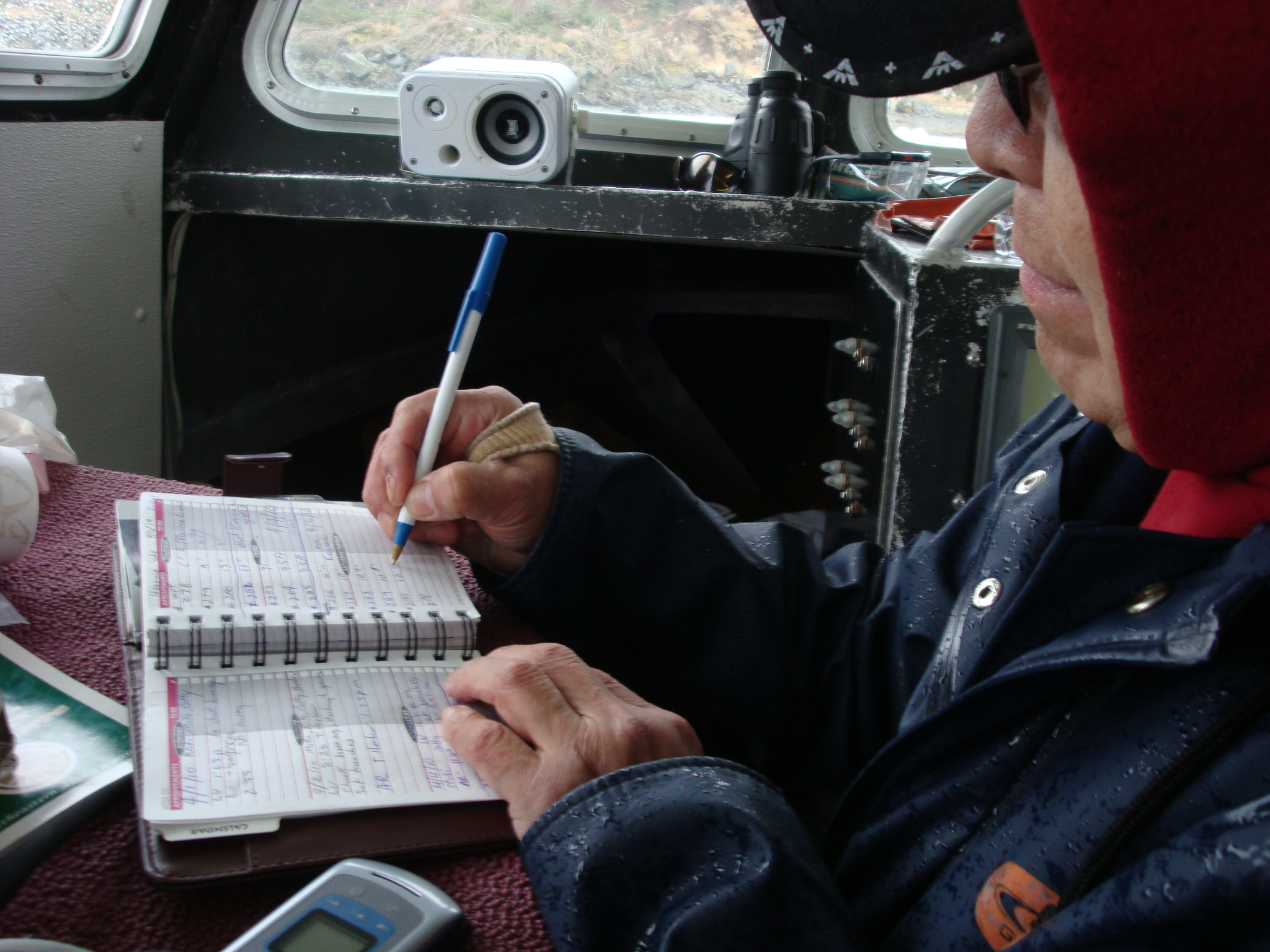Mike Baines' sister, Betty Baines, logs the locations of the hemlock branches.