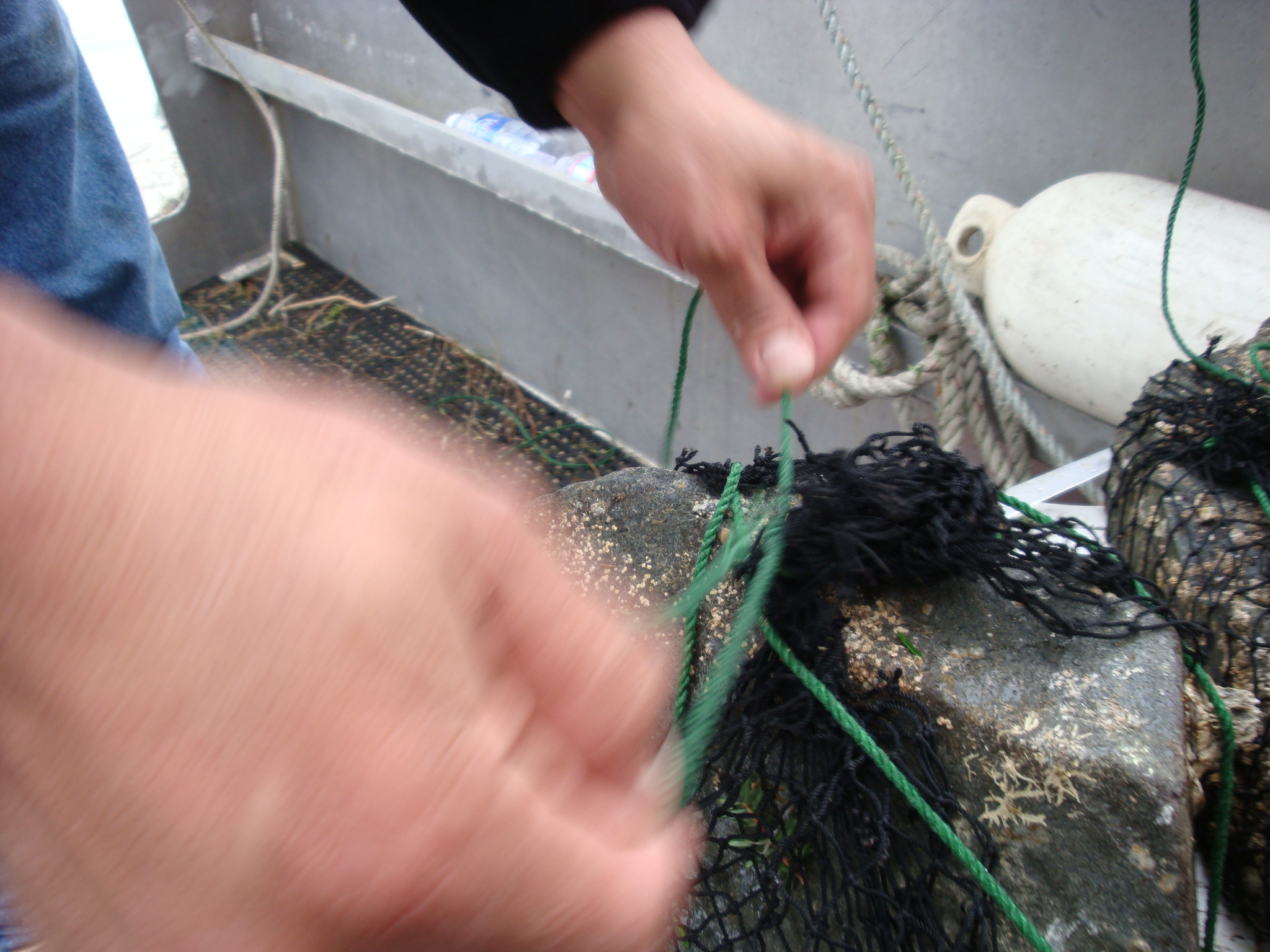 Baines works quickly to tie string to a rock, which will anchor the hemlock branches he's setting near the Kasiana Islands. (Photos by Ed Ronco)