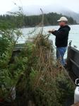 Baines works quickly to tie string to a rock, which will anchor the hemlock branches he's setting near the Kasiana Islands. (Photos by Ed Ronco)