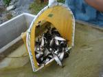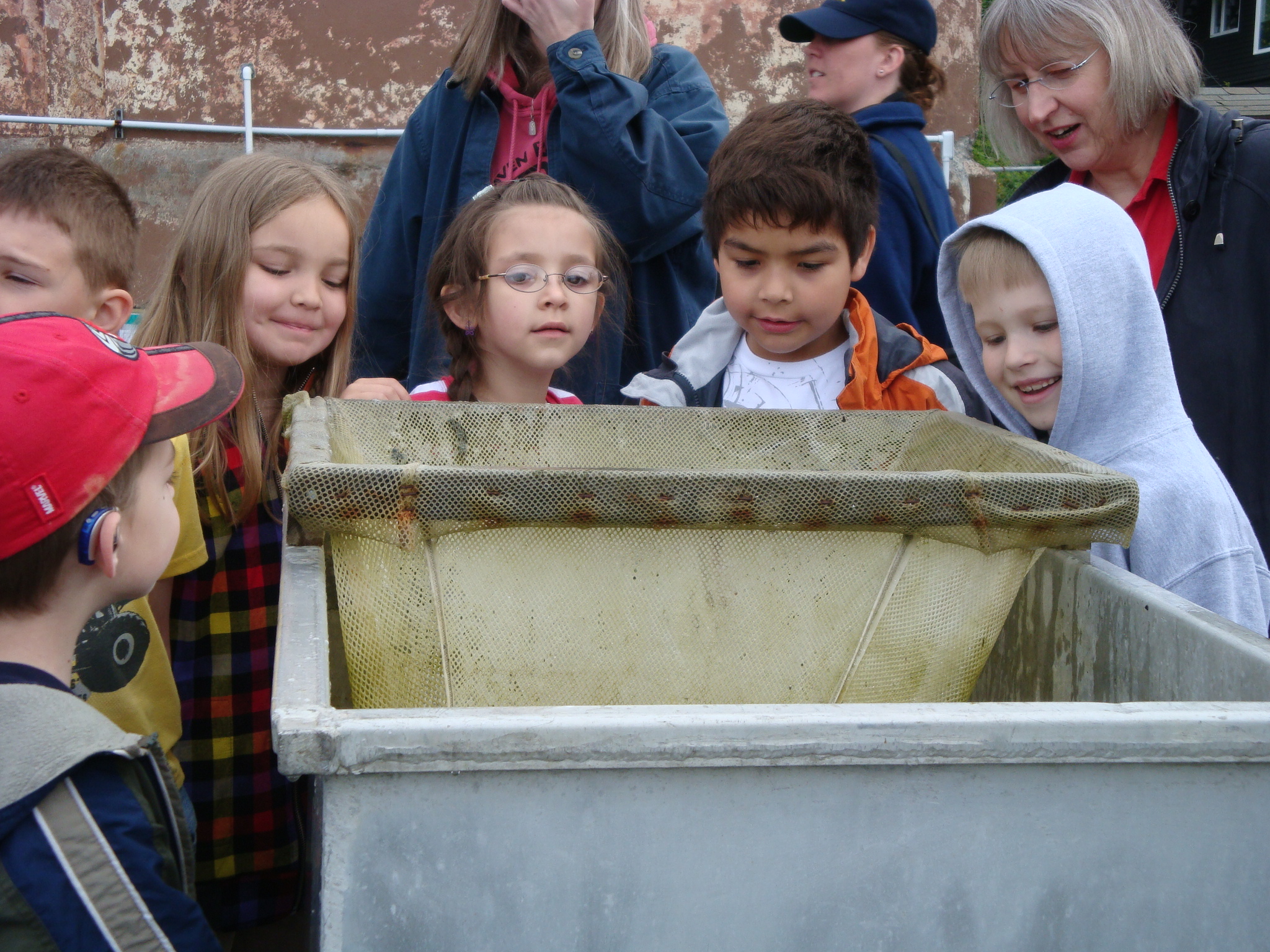 First graders from Baranof Elementary School watch the smolt go down the chute and out to sea.