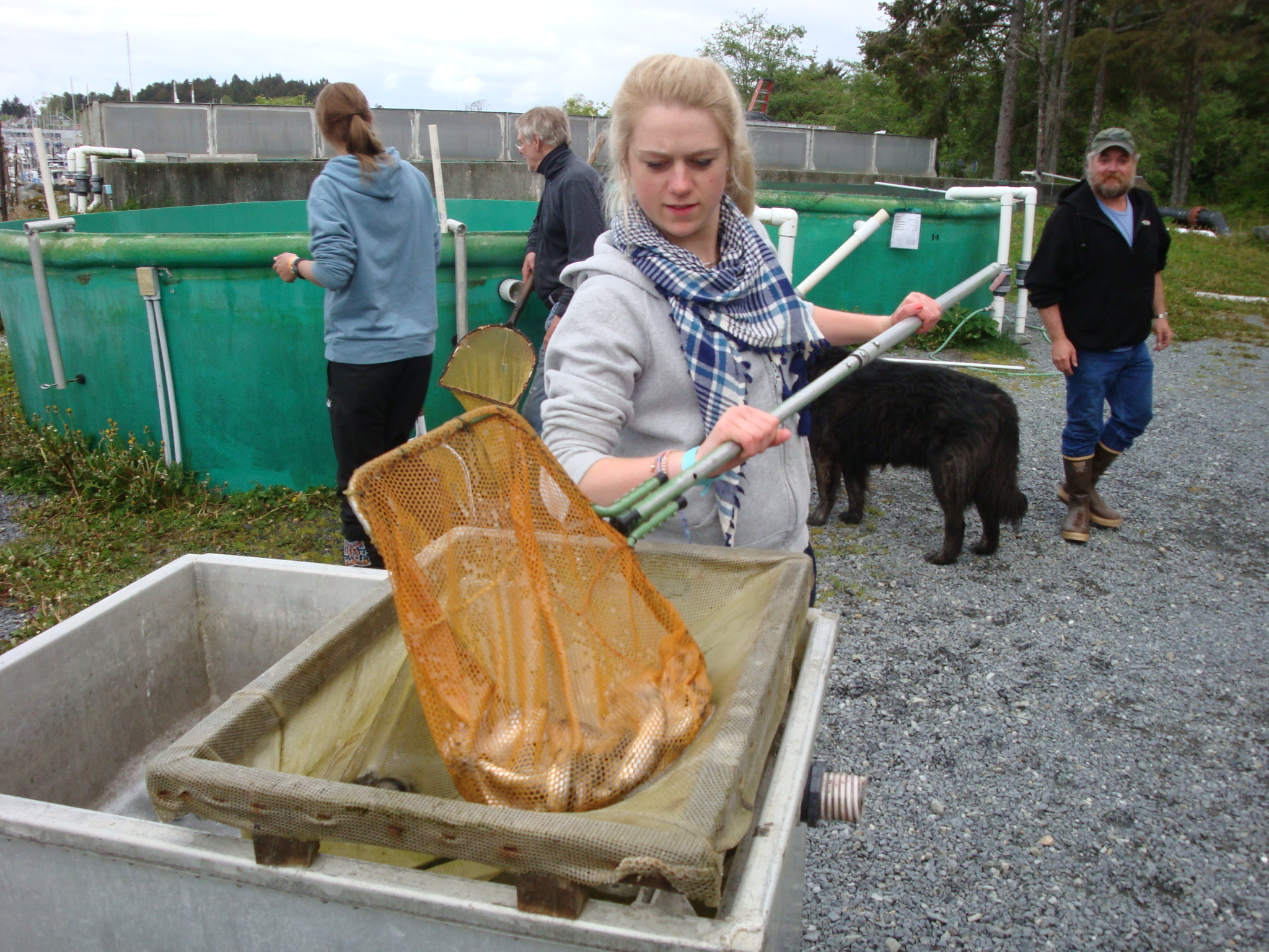Jen Long, visiting from Scotland, moves Chinook smolt into a release chute, to send them out into Sitka Sound. (Photos by Ed Ronco/KCAW)