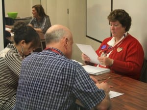 Election officials tally the write-in votes for Phyllis Hackett and Gary Paxton on Tuesday, Oct. 5 at Centennial Hall in Sitka. (KCAW photo/Ed Ronco)