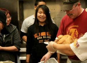 The turkeys come out of tin foil and go onto platters, the mashed potatoes and stuffing are put into bowls that the students hold as they come through the line, and they all make it back to their seats, food intact.