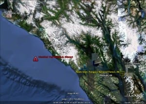 The tug and barge became disabled about 24 miles southwest of Cape Fairweather. (Map by USCG and Google)