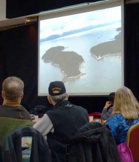 Subsistence board and advisory council members watch a video about traditional fishing in Angoon. Ed Schoenfeld photo.