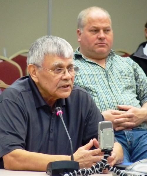 Subsistence Regional Advisory Council Chairman Bert Adams presents recommendations to the Federal Subsistence Board Friday morning as seiner Bob Thorstenson listens. Ed Schoenfeld photo.