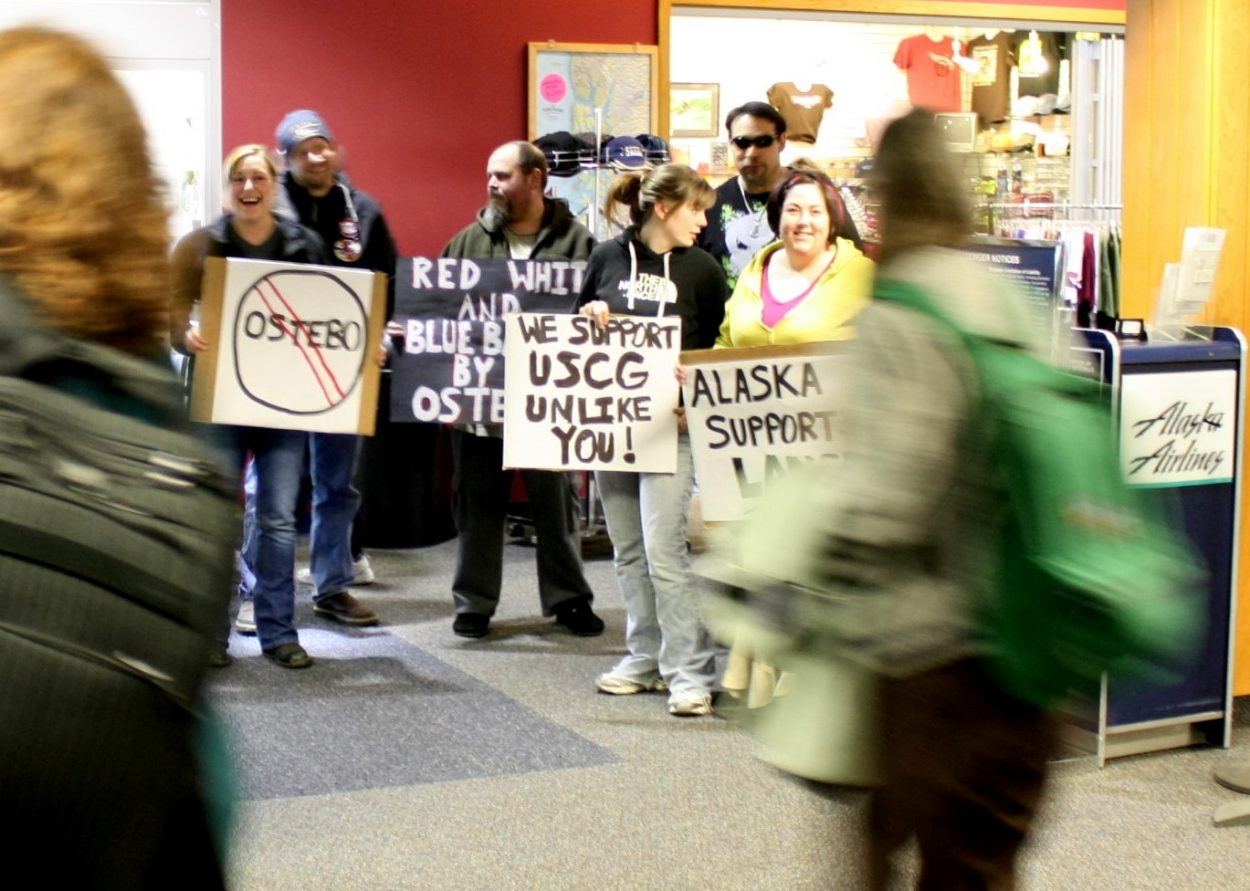 A group of protestors hold signs opposing Rear Adm. Thomas Ostebo, as passengers arrive on Alaska Airlines flight 62 Wednesday morning. Ostebo is the commander of the Coast Guard in Alaska, and he flew to Sitka to meet with Alaska Coast Guard aviators at Air Station Sitka. The protestors are upset that Ostebo pursued formal discipline against Lt. Lance Leone, the co-pilot of a helicopter that crashed in 2010. (KCAW photo/Ed Ronco)