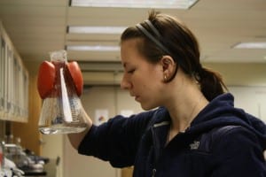 Sitka High senior Justine Webb checks some gel in a lab at the University of Alaska Southeast on March 9, 2012. The gel has to have a certain consistency before it can be used to hold DNA samples. (KCAW photo/Ed Ronco)