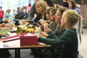 Alaska First Lady Sandy Parnell dines on rockfish scandia at Keet Gooshi Heen Elementary on Wednesday afternoon. Parnell was in Sitka to honor the Fish to Schools Program, which serves fresh fish lunches in three Sitka buildings. (KCAW photo/Ed Ronco)
