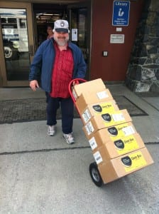 Curt Ledford carts boxes of books from Kettleson Memorial Library to a Sitka Tours bus, for "World Book Night." The event distributes free books to anyone who wants them, and took place in 6,000 U.S. cities on Monday. (KCAW photo/Ed Ronco)