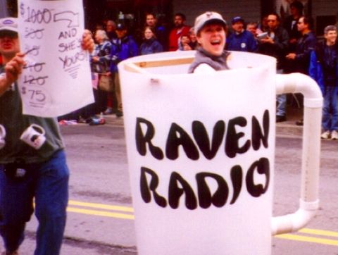 Raven Radio supporter Dave Vastola redefines “special premium” by offering a giant coffee mug filled by his wife, Cheryl, during the Alaska Day Parade in October, 2000. This kind of over-the-brim enthusiasm from station volunteers helped make Raven Radio one of the most mellow-roasted community broadcasters anywhere. Despite an apparent willingness to negotiate, Dave (lucky for him!) had no takers.