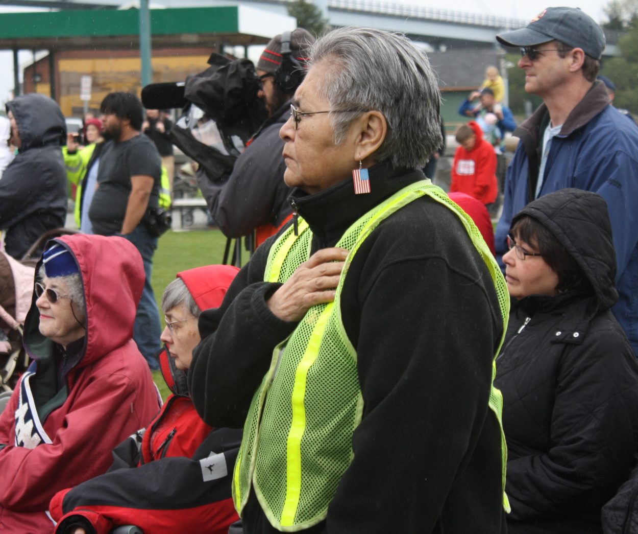 Andrea Craig rises during the playing of military marches. Her late brother, Jacob Peters, was in the Air Force Police. (KCAW photo/Ed Ronco)
